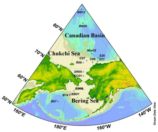 Over the past three decades, PAHs have been monitored mainly in heavily contaminated coastal regions and polluted industrialized zones [2,17,29,30,31,32,33], while investigations in the remote pelagic environments like the North Pacific and Arctic Oceans are sparse as the harsh climate and environment create difficulties for sampling. Despite this, scientists have done a relatively great job concerning POP research in the air and surface water of the Arctic and Subarctic Oceans [28,31,34,35,36,37,38,39,40]. However, there are relatively few studies that have measured concentrations in deep ocean waters or bottom sediments, with some marine sediment studies being limited to coastal area such as the mid- and western Russian Arctic [41,42]; Norwegian Arctic [43,44,45]; Mackenzie shelf area [46]; Saglek Bay, Labrador, Canada [47]; and the Gulf of Alaska [48]. Therefore, for PAHs, the role of sediments in the western Arctic, subarctic oceans, and surrounding deep sea as an exchanging compartment with water and/or permanent sink is not fully understood and requires investigation. The aim of this study was to evaluate the levels, spatial distribution patterns, potential sources, and potential ecological and health risk of PAHs in surface sediments from the Bering Sea, Chukchi Sea, and Canadian Basin.