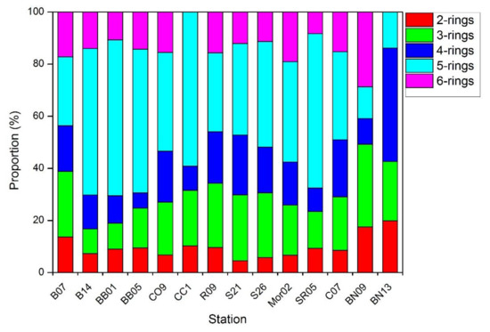 Figure 3 illuminated the proportions of different ring PAHs at the study area. The results reflected that three-ring (4.94 ng/g to 42.24 ng/g) and five-ring (4.2 ng/g to 56.77 ng/g) PAHs were the most abundant compounds in all the stations. It should be noted that the proportion of five- and six-ring components were obviously lower in the Pacific and Canadian Basin (B07, Bn09, and Bn13), which may be due to the fact that PAHs with high log KOW tended to absorbed strongly with particles and deposited nearby from their sources. This hindered their potential to conduct long-range transport to the remote oceans.
