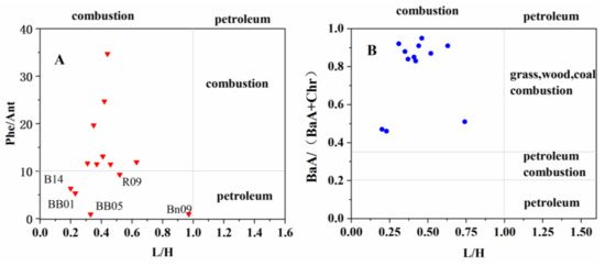 Source apportionment analysis is becoming a routine in investigating the occurrences and accumulations of PAHs in natural environments. There are many methods that can be used to indicate the sources of PAHs, such as isomer ratios method, principle component analysis, chemical mass balance method, and stable carbon isotope method [66,67]. Relatively, isomer ratios were the most frequently used method to infer the sources of PAHs. They determine the possible PAH source by comparing the ratios of selected PAH compounds to the known ratios presented in specific sources. In this investigation, the isomer ratios of PAHs components, Phe/Ant, BaA/(BaA+Chy), and LMW/HMW were chosen to act as chemical tracers to examine possible sources of PAHs in this study. Based on the isomer parameters, the fuel oil/combustion transition point for Phenanthrene/Anthracene is 10, and LMW/HMW > 1 implies petroleum source and LMW/HMW < 1 indicates combustion origin. While BaA/(BaA+Chy) < 0.2 indicates a contribution of petroleum, BaA/(BaA+Chy) > 0.35 indicates the combustion contribution, and if it is between 0.2 and 0.35, it suggests petroleum combustion.