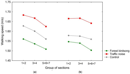 In contrast, there were no significant differences in participants’ walking speeds between the particular sections under the forest birdsong condition. Although the data revealed a slight deceleration of walking speed in sections 5–7, which had a high natural character, these differences were not significant. It seems that the acoustic stimuli that contained sounds from the natural environment had a stronger effect than the visual properties of the route, and affected the participants over the course of the whole experiment. Moreover, the whole walking route contained some level of greenery; thus, participants probably did not feel incongruency between the sounds and visual properties of the route anywhere.
