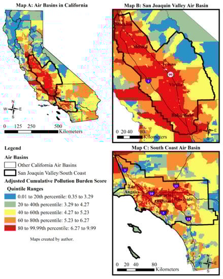 Figure 2 shows the quintile ranges of the adjusted cumulative pollution burden rankings for 8035 census tracts in California. A visual inspection of the maps suggests that elevated levels of adjusted cumulative pollution burden are concentrated in the San Joaquin Valley (SJV) and South Coast air basins. Additional bivariate correlations support this initial observation. Using data for the 15 air basins of California [] that are discussed further below, it was found that the percentile rankings of adjusted cumulative pollution burden are only positively correlated with the percent of tract intersection in the South Coast air basin (Pearson r = 0.525, p < 0.001) and the percent of tract intersection with the SJV air basin (Pearson r = 0.284, p < 0.001) (N = 8035).