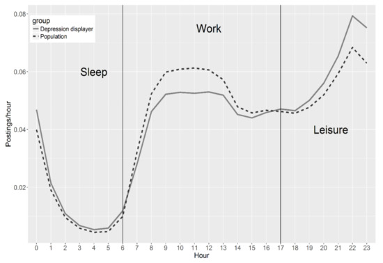 The diurnal activity analysis suggests that depression displayers tend to be more active during leisure and sleep time. It is not surprising that depression displayers tend to be more active during sleep time, because the individuals who suffer from depression are often bothered by insomnia. Previous research has found that people who suffer from insomnia tend to be more active than non-depressive users during sleep periods [5]. However, more research is required to determine why they are also more active during leisure time and less active in work hours. One possible explanation may be that depression displayers were younger on average and tended to more active during sleep and leisure period. Further research is needed to determine whether this is true, because most users’ age information was not accessible on social media. It may be most effective to deliver tailored information to these individuals when they are most active. Further research is required to explore the time of day when information or support would be most helpful.