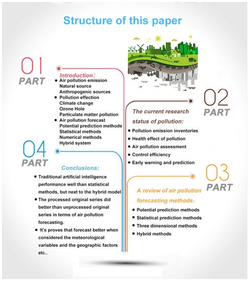 In the following sections, a thorough analysis and summary of the forecasting of air pollution will be provided. The structure of the second section is clearly summarized in Figure 3.