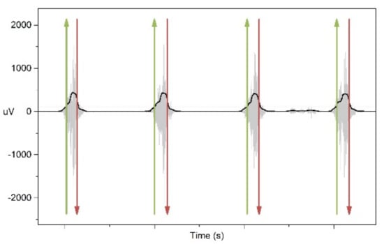 The EMG signals were sampled at 1024 Hz and band pass filtered with cutoff frequencies of 10–500 Hz. The muscles were intermittently activated during the dynamic lifting. The activation pattern of each muscle was identified through a defined threshold level of the EMG signal until the 24 activations were observed. The beginning of each activation pattern was defined through the Root Mean Square (RMS) value with the attained threshold value and ended when the RMS value became inferior to the threshold value for the consecutive data points. MATLAB routines and Origin Pro were used for the processing and statistical analysis. A 250 ms window width was used with a Hanning window type for conversion to the frequency domain using the Fast Fourier transform []. Figure 1 shows the activation of the rectus femoris muscle of a subject. The onset and offset of the muscle are designated by the arrows pointing upwards for the onset and downward for the offset.