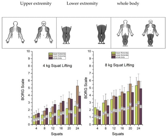 Figure 3 shows that the RPE for 4 kg squat lifting surpassed that of the whole body and the upper perceived exertions until the 16th squat. Conversely, for the 8 kg weight, the RPE for the lower region surpassed both the upper and the whole body RPE after the eight squat. The ANOVA results for the 4 and 8 kg squat lifting for the three regions of the perceived exertions are shown in Table 1. It can be seen at the start and end sessions that the whole body fatigue between the two groups was not perceived differently by the subjects.