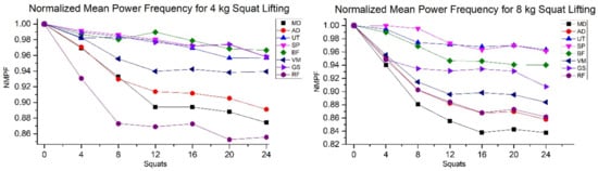 The regression line slopes of the heart rate and NMPF of the eight muscles with respect to squat sets for all eight were calculated (Table 1). The slope of the normalized heart rate was positive as it increases with respect to the exertion level, while for the NMPF, the slope decreased as there is a shift towards the left side in the power spectrum as a muscle experiences fatigue. The muscle with the maximum fatigue was detected through the highest negative slope of the regression line for the upper and lower extremity, respectively. Figure 4 shows the NMPF for the eight muscles for the 4 and 8 kg weight lifts. A decrease in the slope signifies the onset of muscle fatigue.