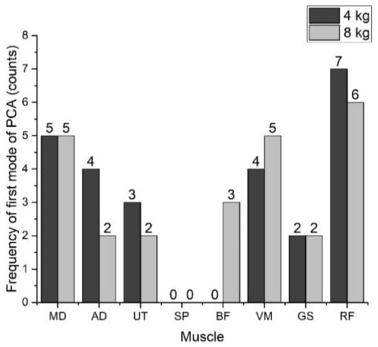 where, is the chosen eigenvalues and x is the corresponding eigenvector. The major muscles during the squatting for the two different types of weight lifting from the PCA analysis were designated as the muscles that had the highest absolute magnitudes ranging between zero and one. For this study, the first two modes of PCA were taken into account. The frequency of muscles that came in the first mode of PCA was counted as they had the highest eigenvalue.