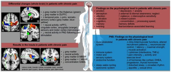 Chronic pain is associated with diverse symptoms and severity, and both functional and structural changes in the central nervous system (CNS) as observed in recent neuroimaging studies (see Figure 1). Pain signals are processed in different brain regions and affect various brain networks, and the term “pain matrix” has been established to describe three major systems commonly affected by pain signals: the lateral and the medial system as the two main afferent pain pathways, and the descending system involved in pain perception [6,7]. Due to the vast efferent and afferent connections of thalamic nuclei it was assumed that chronic back pain patients may show alterations in these subcortical areas.