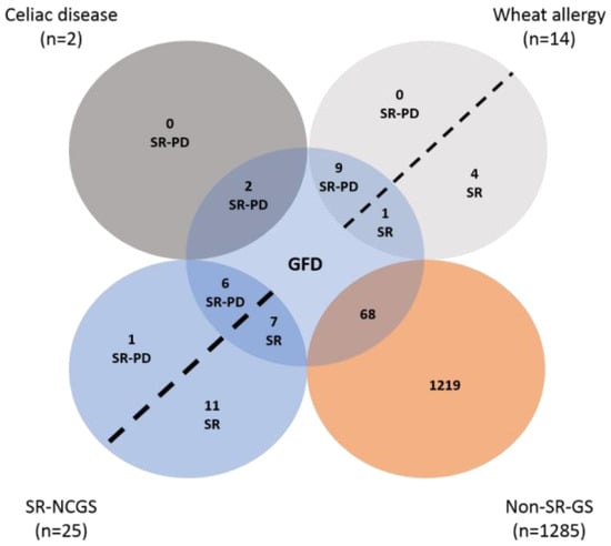 | Wheat allergy | SR-PD wheat allergy (WA *) | Subjects who reported that a physician diagnosed wheat allergy and were also following a GFD * |