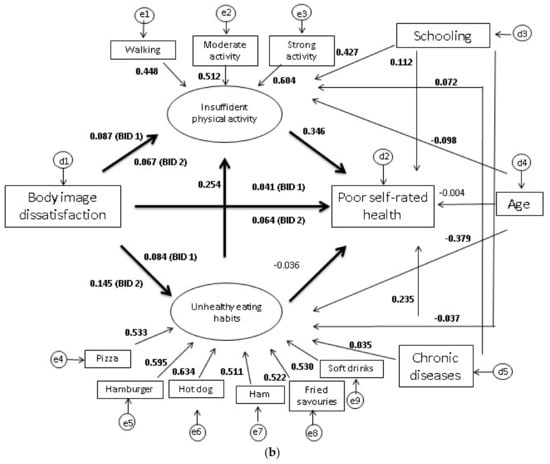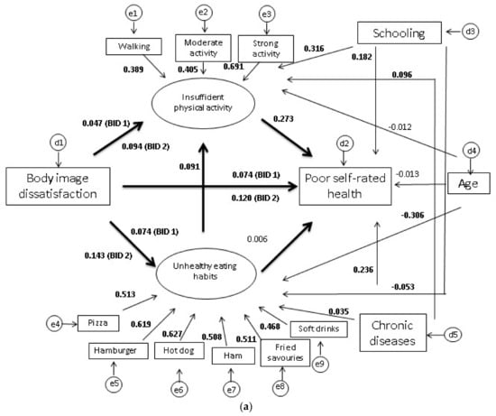 De Oliveira da Silva, P.; Miguez Nery Guimarães, J.; Härter Griep, R.; Caetano Prates Melo, E.; Maria Alvim Matos, S.; Del Carmem Molina, M.; Maria Barreto, S.; De Jesus Mendes da Fonseca, M. Association between Body Image Dissatisfaction and Self-Rated Health, as Mediated by Physical Activity and Eating Habits: Structural Equation Modelling in ELSA-Brasil. Int. J. Environ. Res. Public Health 2018, 15, 790. https://doi.org/10.3390/ijerph15040790