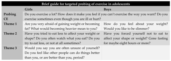 The purpose of the present study was threefold. First, we aimed to estimate the prevalence of CE (primarily with respect to altering weight and/or bodily appearance) in adolescents, where CE turned out to be common, with about one in five boys and one in three girls reporting CE. Second, we aimed to investigate the association of ED-related variables to CE, where we found that adolescents reporting CE had higher levels of ED pathology, scoring on average three times higher than non-CE adolescents. Third, we wanted to devise a brief guide for targeted probing of CE and ED by investigating how self-critical and ED-associated attitudes related to CE. Among boys, CE in combination with being dissatisfied with one’s body weight and restraining one’s diet indicated higher ED risk. Among girls, CE in combination with fear of gaining weight, restrictive eating, and self-doubt indicated higher ED risk. Below, we present a brief guide of relevant questions to ask healthy adolescents to assess the psychological importance of hard exercise with the goal of altering one’s body weight or shape and whether ED risk seems to be indicated (Figure 1). The “Probing CE” questions in the guide include central features of compulsivity: affective withdrawal symptoms when unable to exercise, and continuance (i.e., engaging in the behavior despite risks/negative consequences). These have been shown to be central in previous research [44] and are useful for querying about CE in clinical contexts.