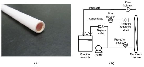 (a) Photo of the nanofiltration (NF) ceramic membrane and (b) schematic diagram of the cross-flow NF filtration system.