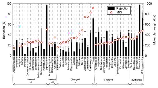 Overall, the rejection of neutral PPCPs increased with higher molecular weight (MW), indicating that size exclusion is an important rejection mechanism for the ceramic NF membranes (Figure 3). There was no discernible difference in rejection between hydrophilic (HL) and hydrophobic (HP) chemicals (Figure 4a). Based on the rejection data with neutral PPCPs, MWCO of the ceramic NF membrane can be estimated to be 400–450 Da. It is noted that the nominal MWCO of the ceramic NF membrane specified by the manufacturer was determined at a different set of operating conditions applied in the present study. Thus, differences in operating condition can explain for the difference in MWCO value determined from our results and the nominal MWCO value reported by the manufacturer. As compared to the neutral PPCPs, most of the negatively charged PPCPs exhibited higher rejections for PPCPs with a MW of 200–400 Da (Figure 4b). The rejection of these negatively charged chemicals may be enhanced with electrostatic repulsion with negatively charged membrane surface. In contrast, most positively charged PPCPs exhibited rejections lower than neutral and negatively charged PPCPs over the MW range. This may have occurred due to “charge concentration polarisation”, which is induced by electrostatic attraction force between positively charged chemicals and negatively charged membrane surface []. Charge concentration polarisation can lead to an increase in concentration of positively charged PPCPs at the membrane surface and thus their concentrations in the permeate. This “charge concentration polarisation” appears to be more prevalent with ceramic NF membrane than polymeric NF membranes [].
