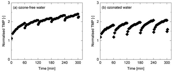Normalised TMP (TMPt/TMPt=0,pw) during NF filtration of the secondary wastewater effluent and surface flushing with (a) ozone-free and (b) ozonated water (permeate flux = 44 L/m2h, feed and flushing water temperature = 20 °C, cross-flow velocity = 0.43 m/s, flushing time = 5 min).