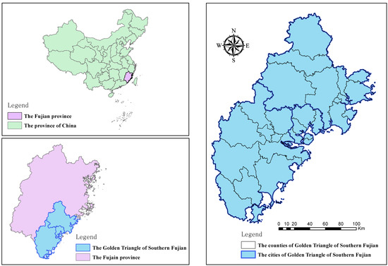 The Golden Triangle of Southern Fujian Province covers the coastal region of China and includes the cities of Xiamen, Quanzhou, and Zhangzhou (Figure 1). The region is located at longitude 116°53′–119°05′ East, latitude 23°32′–25°56′ North and the area is 25,315.39 km2, which represents 1/5 of the total area of Fujian province. The region surrounding the Golden Triangle of Southern Fujian is mountainous and undulating. The terrain slopes upward from northwest to southeast. The influence of monsoon circulation and alpine topography is significant in the Golden Triangle of Southern Fujian. Regional average annual temperatures are 18–25 °C. Rainfall is very abundant, averaging 1500–2100 mm annually. Soil types in the region are complex and diverse and are classified into brick and red soil, clay soil, gravel soil, windblown sand soil, saline soil, tidal soil, and others. The total human population is greater than seventeen million people, accounting for about 40% of the population of Fujian Province. The region’s economic output accounts for 55% of the total output of Fujian province and it is one of the most economically dynamic regions in China.