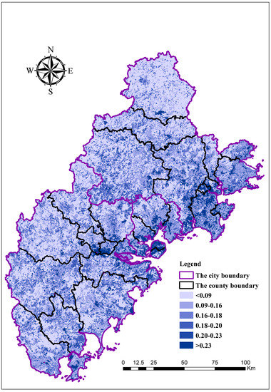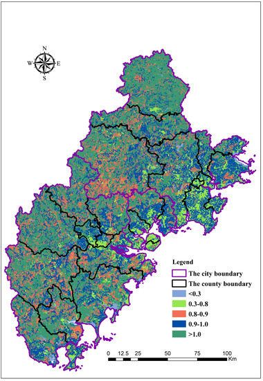When the distribution of landscape types is balanced, the value of H is high. As shown in Figure 2, the landscape diversity index value of the entire region is 0.78 and ranges between 0.42 and 1.23, depending on the county. The highest value is 1.23 in Dehua, which suggests that the diversity of various landscape types in this county is relatively balanced and the composition of landscape structure is more complex than in other counties. The landscape diversity of Si’ming is lowest, which is likely because of the high proportion of cultivated land (68.04%) and the low proportion of other landscape types.
