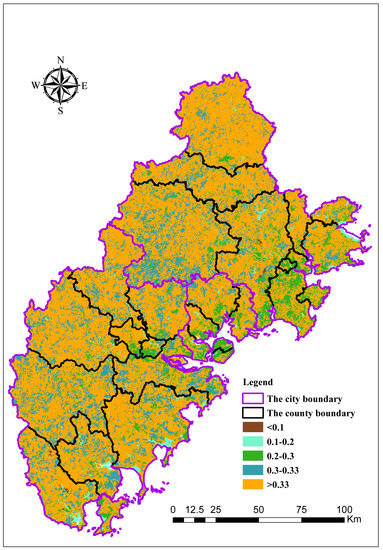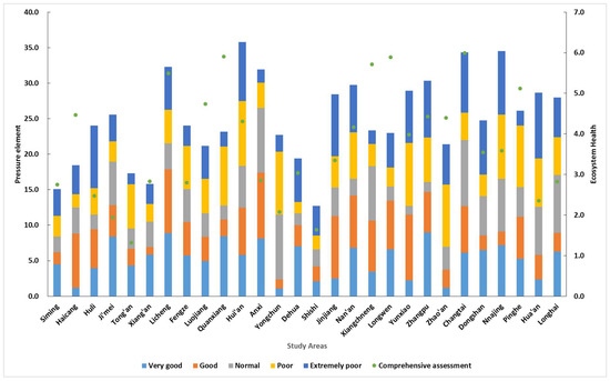 The “pressure” element indicates the cause of the deterioration to the ecological environment. The greater the pressure, the worse the health of the ecosystem. We compared the pressure elements of 28 counties in different ecosystem health areas. The results are shown in Figure 7. The pressure elements are greatest in the Si’ming, Huli, Hua’an, Ji’mei, Shishi regions, where the regional GDP and foreign trade volume index are higher than those in other regions, and the development of regional economy is fastest.