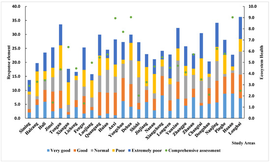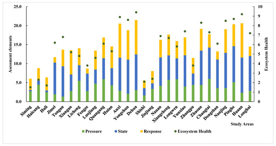 The comprehensive evaluation of ecological health in different counties can be seen more clearly in Figure 5. Here, we can see that pressure, state, and response vary by region. The “pressure” of Anxi, Yongchun, Nan’an, Dehua, and Hua’an is small, while the “state” and “response” values are large. However, Shannon’s diversity index, Shannon’s evenness index, and the woodland coverage index are higher in these regions. These regions possess numerous enterprises and relatively developed economies, so the “state” and “response” values are higher. In Jimei, Tongan, Fengze, Longhai, Dongshan, and Changtai, the “pressure” and “state” values are high and the “response” value is relatively low. The primary reason for this result is that the level of economic development in these regions is low. Although the health of the ecosystem is relatively good based on the evaluation units, the economy should be actively developed in order to protect the natural environment. In the regions of Si’ming, Haicang, Huli, Shishi, Jinjiang, and Zhangpu, the “pressure” and “response” values are relatively high, but their “state” values are small. The overall ecological condition of these regions is relatively poor, primarily because these regions are more developed and there is more pressure on the environment. However, the infrastructure in these regions is high quality, which can reduce the negative impact of human activities on the environment. As a result, the response value of the ecosystem is high.