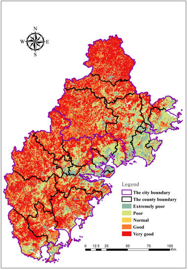 There are distinct variations in ecosystem health across the Golden Triangle of Southern Fujian. The ecological health throughout most of the study regions is good, but there is spatial heterogeneity, which follows a clear spatial distribution pattern. In general, the western region is superior to the eastern region. The level of ecosystem health in the west is better than in the east. As shown in Figure 5 and Figure 6, Anxi, Yongchun, Dehua, Nanjing, Yunxiao, and Hua’an are in good health, likely because these areas are relatively far from industrial areas, the effects of human activity are relatively small, and forest coverage is high. The vitality, restoring force, and service functions of the regional ecosystem are relatively strong in the counties mentioned above. The ecosystem health of Si’ming, Haicang, Huli, Licheng, and Shishi is poor, likely because of a high population density, a high level of human activity, and the irrational structure of the ecosystem.