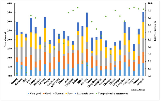 The “state” element is used to represent changes in the ecosystem caused by human interference with the natural environment. The developing economy in the region has led to the construction of convenient transportation and a high living standard in the population, which in turn has caused increased urbanization, overpopulation, and human disturbance to the ecosystem. We compared the state elements in 28 counties (Figure 8). The state elements are extremely poor in the Si’ming and Haicang regions, but are relatively good in the Changtai, Pinghe, Dehua, Nanjing, and Hua’an regions.