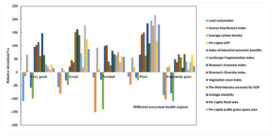 Relative deviation of the 17 factors in different ecosystem health regions.