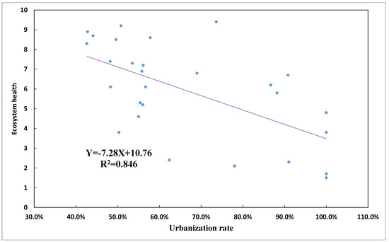 In order to verify the relationships between rapid urbanization and ecological health, we conducted regression analyses on values for the urbanization rate and the ecosystem health in the 28 counties. As shown in Figure 11, urbanization factors display a significant negative correlation with ecological health, at a significance level of 0.01. The higher the urbanization of the regional ecosystem, the lower the level of ecosystem health.