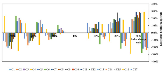 When the evaluation index changes rated at ±10%, ±20%, ±50%, we analyzed how the ecosystem health evaluation value changed. This allowed us to identify the importance of each evaluation index to the overall ecological health level of the region and provide a framework for prioritizing projects that may impact the environment. The sensitivity analysis is shown in Figure 12.