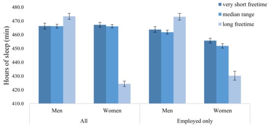 Marginal means of sleep time by gender and three free time categories: All and the employed only.