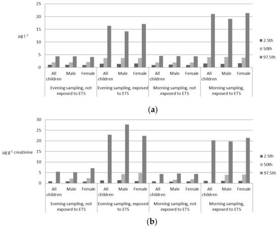 Reference values of urinary cotinine levels (expressed both as µg L−1 and µg g−1 creatinine) for children not exposed and exposed to Environmental Tobacco Smoke (ETS) calculated for all participants and according to gender: (a) urinary cotinine levels expressed both as µg L−1; (b) urinary cotinine levels expressed both as µg g−1 creatinine.