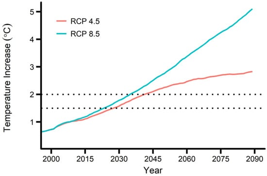 During the 2015 United Nations Climate Change Conference held in Paris, 195 countries of the world strengthened the United Nations Framework Convention on Climate Change by agreeing to limiting the increase in the global average temperature to well below 2 °C above pre-industrial levels and pursuing efforts to limit it to below 1.5 °C []. These targets were determined to render the total impact of climate change tolerable. Now, it is important to investigate the health impacts of global temperature increases of 1.5 °C and 2 °C, to determine if such increases are indeed tolerable.