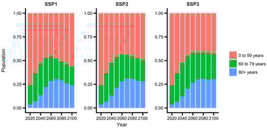 Figure 2 shows the predicted population composition changes under the three SSP scenarios (SSP1, 2, and 3). The three SSP scenarios reflect low, intermediate, and high challenges for mitigation and adaptation, respectively. Since South Korea is one of the fastest aging countries worldwide (Lee and Kim, 2016), the portion of the elderly population has been increasing rapidly. The proportion of the “oldest-old” age group (individuals aged ≥80 years) is expected to increase until the 2070s under all three SSP scenarios. However, thereafter, it will slowly decrease under the SSP1 and SSP2 and remain roughly constant under the SSP3. The “oldest-old” age group will account for 25.7%, 28.2%, and 28.9% of the population in the year 2100 under the SSP1, 2, and 3, respectively. Similar findings were observed for the “old” age group (individuals aged ≥60 years); the proportion of this age group is expected to be 45.3%, 51.4%, and 56.3% in the year 2100 under the SSP1, 2, and 3, respectively. The definitions of “oldest-old” (≥80 years) and “old” (≥60 years) populations follow the definitions used in the population ageing report by the United Nations []. We observed similar trends for the “all age”, “old age”, and “oldest-old” age groups (Figure S1). Moreover, the aging and population trends were similar across all seven cities (Figure S2).