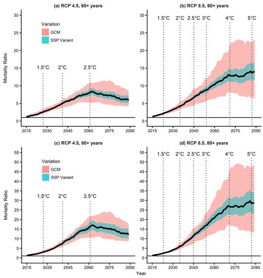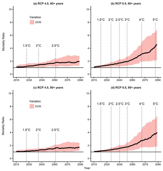 Supplementary Table S2 summarizes the MRs according to temperature increases of 1.5 °C, 2 °C, 2.5 °C, 3 °C, 4 °C, and 5 °C. The MRs for 2.5–5 °C were added for reference. We found similar MRs across all three age groups (see Table S2). The MR under the RCP 4.5 increased until the 2060s and saturated at 1.5~1.8; in contrast, the MR under the RCP 8.5 kept increasing and reached 3.3~4.2 in the 2090s.