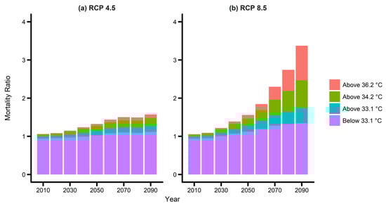 Mortality ratios according to an increased intensities and frequencies of extreme temperatures under: (a) RCP 4.5 and (b) RCP 8.5. Temperatures of 33.1 °C, 34.2 °C, and 36.2 °C correspond to the 90th, 95th, and 99th percentiles during the baseline period. RCP, Representative Concentration Pathway.