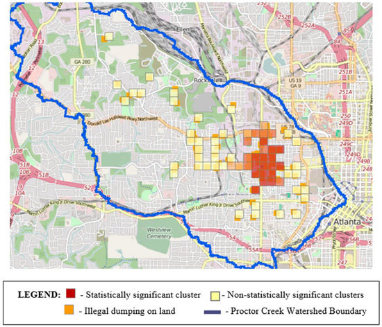Statistically significant clustering of areas with illegal dumping mapped by community researchers in the Proctor Creek Watershed.