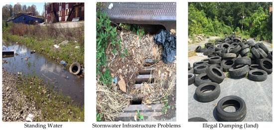 In Figure 3 and Figure 4, the orange- and red-colored blocks represent hot spots or a statistically significant clustering of high values. The darker the color, the higher the confidence levels (ranging from 90% to 99%). Yellow blocks are not statistically significant. No cold spots (blue-colored blocks representing statistically significant clusters of low values) were identified in any of our analyses, however, there were both hot spots and areas in which the patterns are random (depicted by yellow blocks). Individual analyses of the illegal dumping on land and stormwater infrastructure challenges data revealed 28 and 23 statistically significant features, respectively, based on application of a false discovery rate (FDR) correction for multiple testing and spatial dependence. These clusters are shown in Figure 3 and Figure 4. In Figure 5, we display a heat map that allowed the community researchers to visually examine where the highest density of both illegal dumping on land and location of stormwater infrastructure problems exist. The map visually represents the largest areas where most of the points are concentrated. Because heat maps only account for the geographic location of point features on a map, statistical significance cannot be assumed [47]. To provide further evidence of environmental stressors, the mapping application also includes photographs taken by community researchers (examples provided in Figure 6).