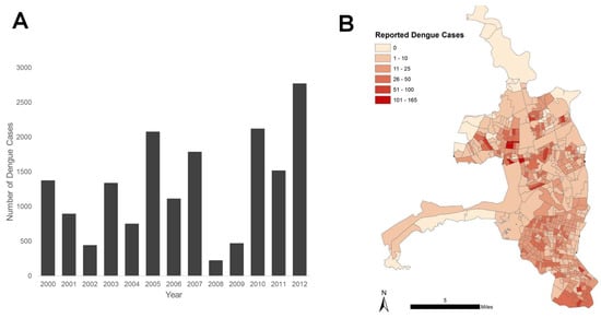 The objectives of this study were to describe the spatial dynamics and social-ecological risk factors during an epidemic of dengue fever (2012) in Guayaquil, Ecuador, when more than 4000 cases of dengue (79 dengue hemorrhagic fever-DHF) were reported, marking the biggest dengue outbreak in recent years []. There were 4248 clinically reported cases of dengue fever—an annual incidence of 18.07 cases per 10,000 people compared to an average annual incidence of 4.99 cases per 10,000 people from 2000 to 2011 (Figure 1) []. This analysis builds on prior studies in Machala, Ecuador, that demonstrated the role of social determinants in predicting dengue risk at the household and city-levels, and contributes to a broader effort to strengthen surveillance capacities in the region through collaboration with the Ministry of Health (MoH) and the National Institute of Meteorology and Hydrology (INAMHI) of Ecuador [,]. This study is intended to both provide the much needed local-level social-ecological context, and to demonstrate the differences arising in inference from presence and burden of cases in these analyses.
