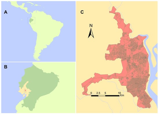 The study site, Guayaquil, is located within Guayas province in coastal Ecuador. (Panel A) shows the location of Ecuador (medium green) in S. America (bright green); (Panel B) shows the location of Guayaquil (dark orange) within Guayas Province (warm yellow), in Ecuador; (Panel C) shows the city of Guayaquil, detailing the census block structural layout, and showing where major and minor waterways exist surrounding the city limits.