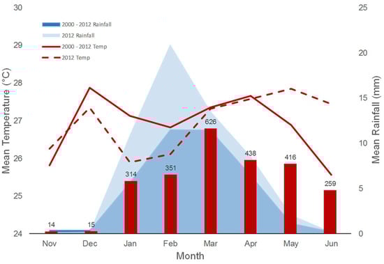 Climate seasonality and dengue cases in Guayaquil, Ecuador. The bold red line shows the monthly mean temperature from 2000–2012 in comparison with monthly mean temperature for 2012 (red dashed line). The dark blue shading shows the monthly mean rainfall from 2000–2012 in comparison with monthly mean rainfall for 2012 (light blue shading). The red bars show monthly totals of confirmed dengue cases from 2012.