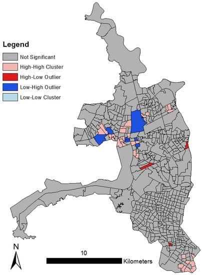 Dengue incidence in census zones ranged from 0 cases (n = 88 zones) to 160 cases per 10,000 population (n = 1 zone) (Figure 4). We found that dengue incidence was non-randomly distributed (e.g., clustered; Moran’s I = 0.066, p < 0.05). We identified dengue hotspots in the North Central and Southern areas of the city (n = 30 high-high census zones; p < 0.05, Figure 4). These clusters comprised clusters of high neighboring census zones (n = 30), with both high and low outlier zones, (high-low and low-high), indicating hotspots and heterogeneity.