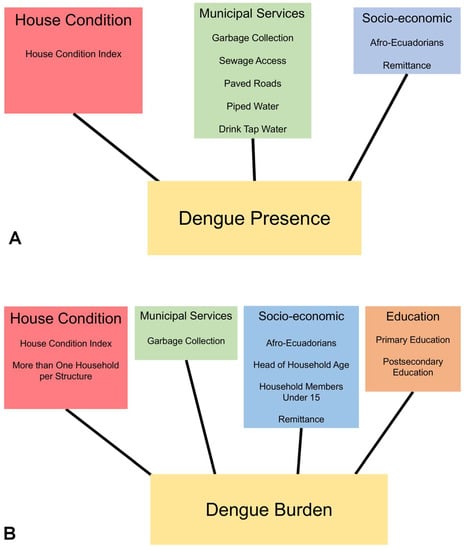 Conceptual diagrams highlighting the census variable suites that significantly affected dengue presence (A) and dengue burden (B) in Guayaquil, Ecuador during the 2012 outbreak.