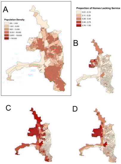 Population density (people per km2) of census zones in Guayaquil (A) shown against the proportion of homes lacking municipal garbage collection (B); lacking municipal sewage (C); and lacking piped water (D). Although dengue cases were reported in both densely and sparsely populated census zones, dengue hot spots were more associated with higher density zones (Figure 1), and the proportion of homes that lack basic municipal services tends to be higher in zones with lower population density. This may account for the counterintuitive model estimates associated with lack of these services (Table 2 and Table 3).