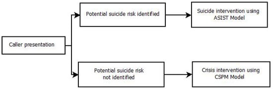 Training procedures between crisis helplines vary, but across telephone crisis-line services, standardised training protocols tend to apply general guidelines for the identification of callers in a suicidal state and strategies to reduce callers’ current experience of crisis and/or suicidal states. Most also aim to ensure the safety of callers by emphasizing the need to “set aside assumptions about who may be at risk of suicide (usually based on membership in a “higher-risk” group)” [] and to treat callers as individuals by responding to their unique presentation to identify potential suicidality and direct subsequent support decisions. For example, crisis-line staff (referred to in this article as telephone crisis-line workers: TCWs) at a national telephone crisis helpline in Australia are trained using two intervention models to facilitate efficient and appropriate responses to people in crisis: the Crisis Support Practice Model (CSPM) [], and the Applied Suicide Intervention Skills Training (ASIST) model []. The CSPM guides TCWs’ use of skills involved in connecting with the caller, focusing the call, relieving distress, enabling coping and deciding on next steps. TCWs are trained to monitor every caller’s potential suicidality, regardless of group membership, while progressing through the CPSM by asking about suicidal thoughts in every call. Once the possibility of suicide risk is described by the caller through direct or indirect suicide signs (e.g., callers directly discussing thoughts of suicide, indirect talk of “leaving it all behind”, etc.), TCWs are directed to apply skills from the ASIST model, which are focused on ensuring caller safety [,]. In this way TCWs’ training resembles an ‘if–then’ decision model; if the possibility of suicide risk is identified as a presenting issue then the ASIST model is to be used to specifically check for suicide risk, if the possibility of suicide risk is not identified, then the CSPM is the only model that TCWs implement (see Figure 1).