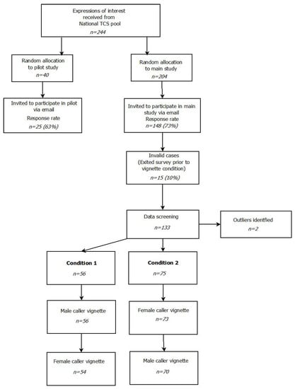 The study protocol was approved by the University of Wollongong Human Research Ethics Committee (16/135) and UnitingCare Queensland Human Research Ethics Committee (Wilson C.19016). After approval from relevant ethics review boards, Telephone Crisis Support Centre Managers who consented to allow TCWs from their centres to participate in the study were asked to distribute an online expression of interest form among active TCWs. Participants were told that the research required completing an online survey that included questions about TCWs’ decision-making with callers. The study focus on suicidal callers was not explicitly mentioned. The TCWs who expressed interest in participating in the research project were approached only once by the research team and those who provided consent to participate in the study were assigned to either the pilot or main study (see Figure 3).