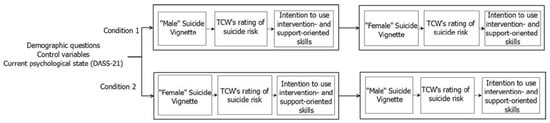 The study design and procedure was developed within the context of a community-academic partnership (CAP) using a co-design process [] (a detailed description of the CAP and project co-design can be found elsewhere []). The co-design process utilized a structured approach to seeking feedback from different levels of the crisis helpline to develop a design approach that was suitable for the context. Since the impact of gender on TCWs’ support of suicidal callers has yet to be examined, an experimental design wherein gender was manipulated was nominated as the most prudent approach. Such a design would allow the initial exploration of the impact gender may have on the process of help-provision compared to the baseline provided by TCWs’ standardized training. The feedback process identified that it was a priority to develop a design that was as succinct as possible for participants who were predominantly volunteer TCWs with high workloads. As a result, this study used an online self-report survey in a repeated-measures vignette design to systematically examine whether caller gender might influence the information that TCWs identify as important when deciding whether a caller might be suicidal and whether to prioritise the use of support-oriented or intervention-orientation skills with the caller. To implement the design, participants were randomly assigned to one of two groups and exposed to both study conditions which used the same caller vignette with different names and gender pronouns (see Figure 2; more detail below). The order of vignette presentation was counter-balanced to examine whether the gender of the caller initially presented might influence the information TCWs attended to throughout the study survey Figure 3). Repeated-measures designs with the use of vignettes have been used successfully, with minimal evidence of evaluation effects that impair interpretation of study results [].