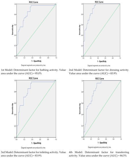 All the logistic regression models performed in determining ADL’s dependent factors have values that could be categorized into a fair category, which meant that the models were strong and acceptable. The average score of the area under the curve (AUC) for all the models were greater than 80% [33].