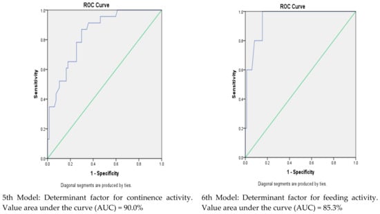 To determine the strength of the regression models, the receiver operating characteristic (ROC) analysis test was performed. For the first model, the determinant factor for bathing activity, showed the area under the curve (AUC) of 95%. Both second and third models, the determinant factor for dressing and transferring respectively, showed the AUC of 83.9%. The AUC for the fourth model (the determinant factor for toilet activity) and fifth model (determinant factor for continence activity) showed the AUC values of 84.5% and 90.0% respectively. The final and sixth model (determinant factor for feeding activity) showed the AUC value of 85.3%. Figure 1 showed ROC curve with AUC values for all of the six regression models. All the models have AUC values in the good category and acceptable.