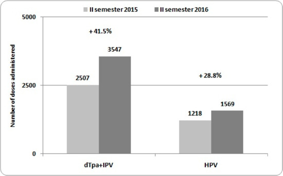 Figure 1 shows the number of single-dose anti-diphtheria-tetanus-pertussis-poliomyelitis (dTpa + IPV) and anti-papillomavirus (HPV) vaccines carried out in the district of Palermo during the second semester of 2015 and 2016(from the 1st of July until the 31th of December). An increase in the number of administered doses of dTpa + IPV (+29.3%) and HPV (+22.4%) vaccinations was observed.