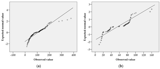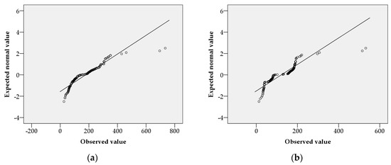 Normal quantile–quantile (Q–Q) plots of impact distances according to weather variables in urban conditions: (a) using the Areal Location of Hazardous Atmospheres (ALOHA) tool; (b) using the Korea Offsite Risk Assessment (KORA) tool.