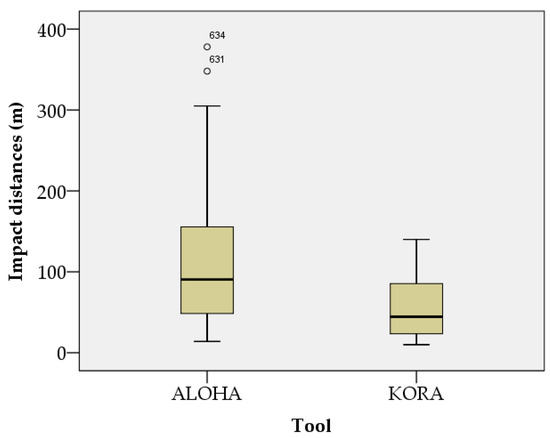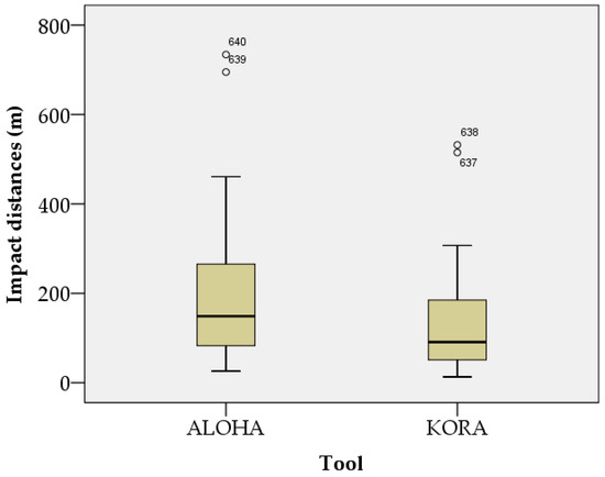 The effect of humidity on impact distances was not significant (p = 0.112). In other words, there was no change in impact distances according to humidity. Unlike humidity, temperature, wind speed, and atmospheric stability affected damage distances significantly (p < 0.05). The impact distances in urban and rural conditions were largest according to atmospheric stability, while those according to air temperature were greater than those according to wind speed. Moreover, the ALOHA tool had larger impact distances than the KORA tool. Therefore, atmospheric stability in urban and rural areas was the most sensitive factor for the KORA and ALOHA tools, while air temperature was a more sensitive factor than wind speed. The KORA and ALOHA tools were more sensitive to atmospheric stability, air temperature, and wind speed in rural conditions than in urban conditions. In addition, the ALOHA tool was more affected by atmospheric stability, air temperature, and wind speed than the KORA tool. Users of the KORA and ALOHA tools need to be careful to not commit input errors in atmospheric stability, which was the most sensitive factor, so as to reduce variation in damage distances due to those errors. In particular, the ALOHA tool was more sensitive to atmospheric stability, air temperature, and wind speed than the KORA tool. Therefore, users should be more careful to not commit input errors regarding weather variables when using the KORA tool than when using the ALOHA tool.