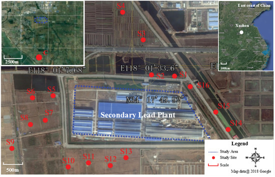 This study area was located in Xuzhou (34°18′11″ N, 118°2′17″ E) in Eastern China. The area enjoys a warm, semi-humid monsoon climate with an annual average temperature of 14.0 °C, an annual average rainfall of 867.8 mm, and an annual average of 2318.6 sunshine hours [31]. The secondary lead plant mainly uses waste lead–acid batteries as the raw material to produce fine lead and alloy lead. The annual secondary lead production is nearly 600,000 tonnes. Moreover, the annual design recovery capacity of waste lead–acid battery is about one million tonnes. It is one of the largest plants in the comprehensive utilization of waste lead–acid batteries in China [32].